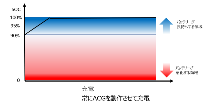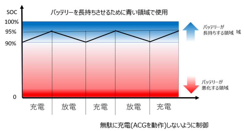 そこでバッテリに着いているセンサーから、バッテリーの充放電量を検出し、余計にACGを動かさないように制御をしています。