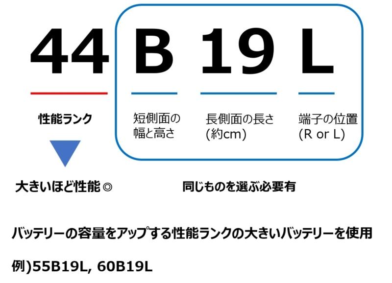 バッテリーの型式には、44B19Lなどがありますが、それぞれの英数字が示す意味は下記の通りです。