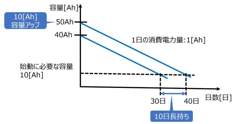 50Ahの場合40日で始動に必要な容量を下回るため、40日までバッテリーが持ちます。