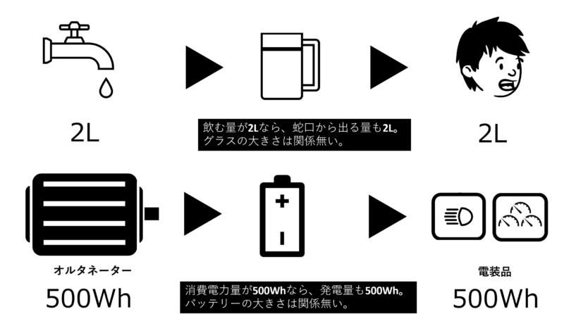 それと同じで、電装品の消費電力量は変わらないため、オルタネーターの発電量も同じとなります。
